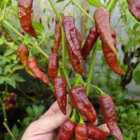 Сорт стабилен, семена f6. Растение высотой до 90 см с хорошим боковым ветвлением. Чем то напоминает Bhut Jolokia Chocolate, но более неприхотлив, пластичен и очень большим потенциалом по урожаю. Срок вегетации 130–140 дней при выращивании в теплице. Острота до 1, 2 миллиона сковиллов. Вкус стручков сладкий, аромат фруктовый с землянисто-дымными нотами.
